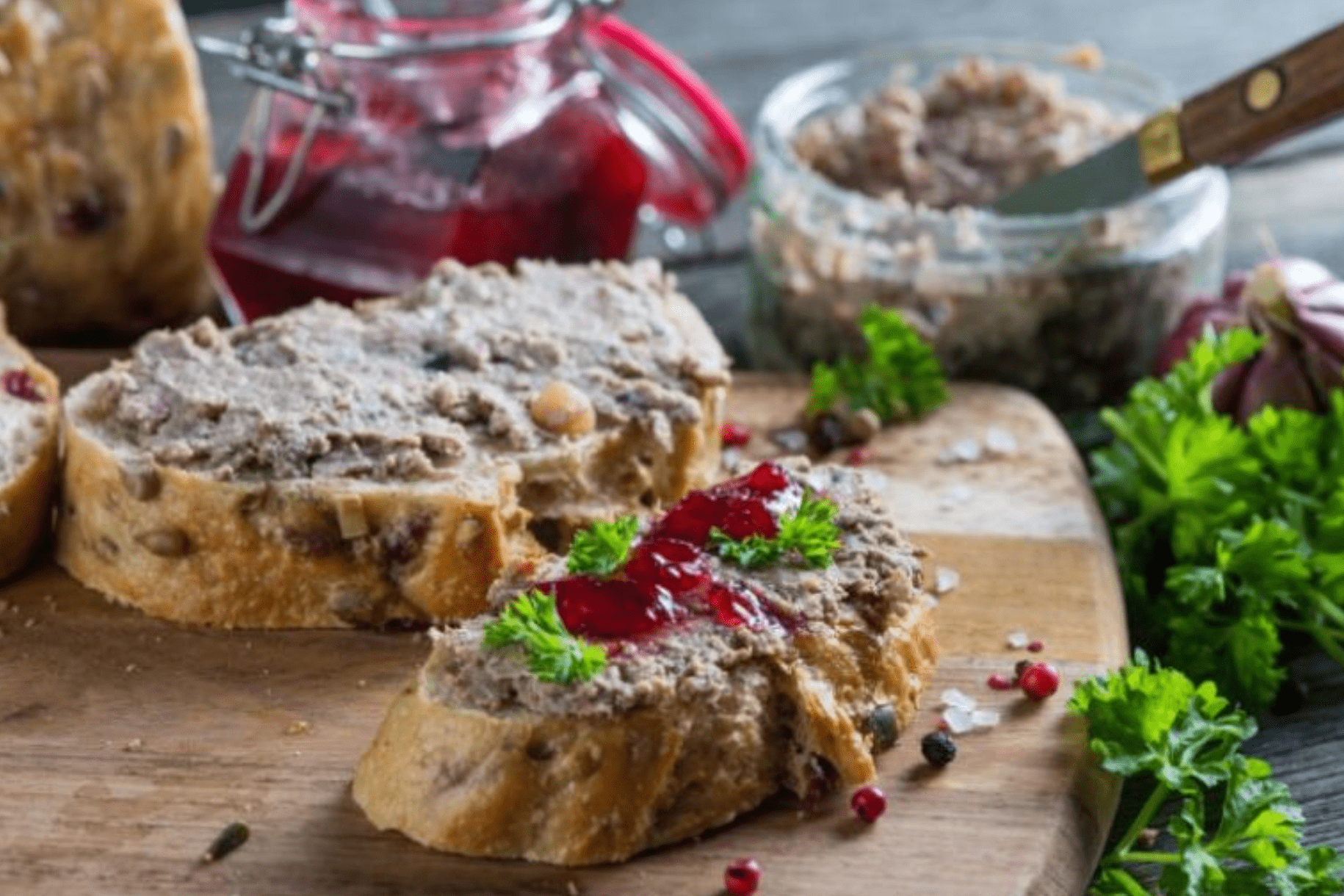 Feldovic paštika z husích jater, portská cibulka, ananasové chutney, pečivo