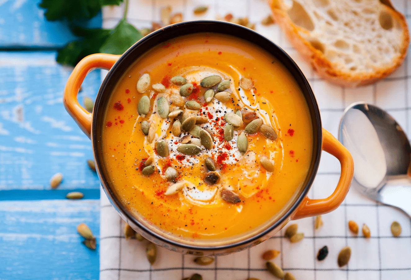 Dýňový krém se zázvorem, pražená dýňová semínka, dýňový olej, bagetka