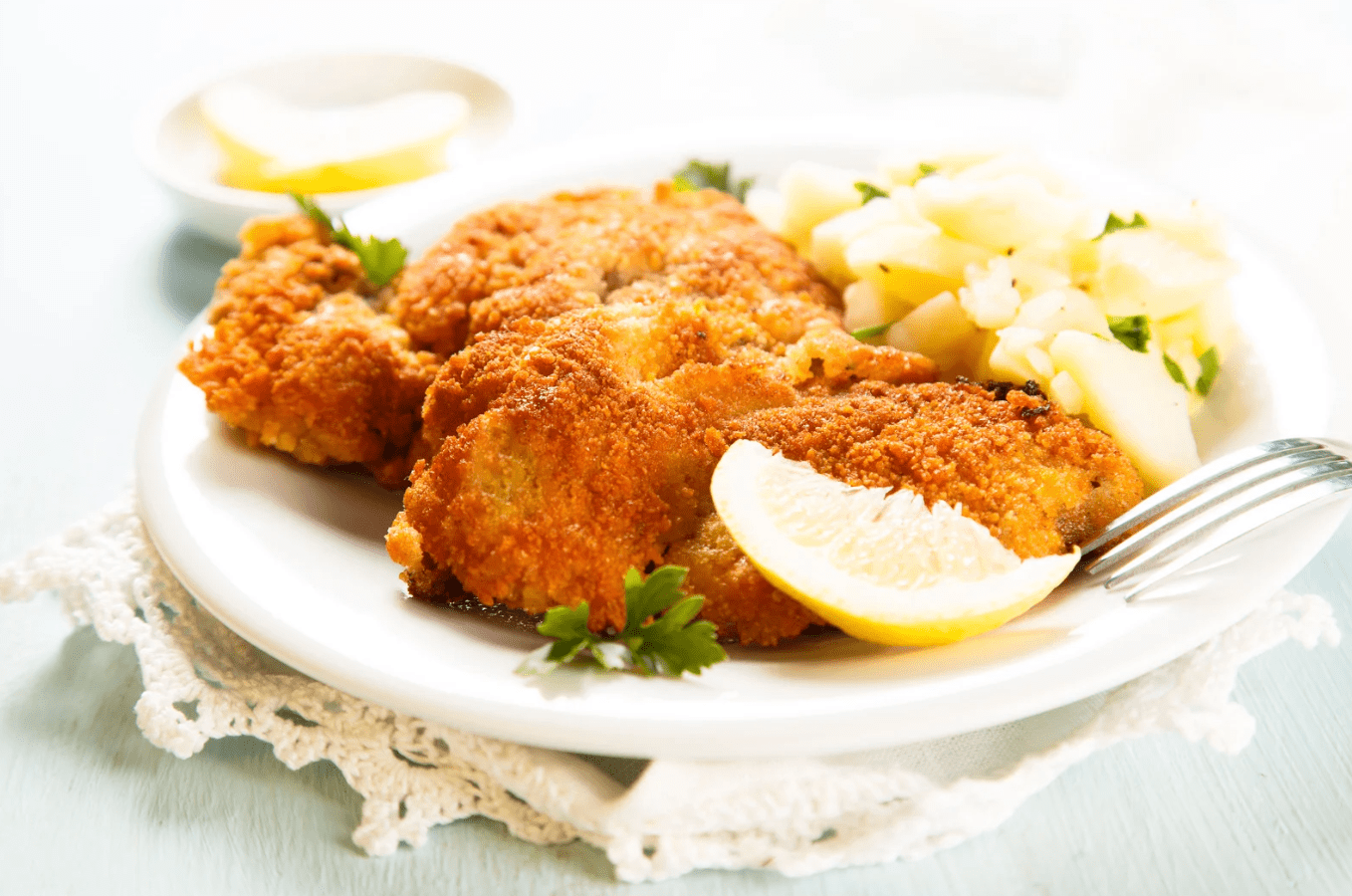 Kuřecí řízek, selský bramborový salát, citron